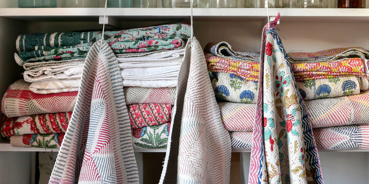 A kantha stitch blanket is made from layer upon layer of cotton fabrics which have softened and become worn over time. These quilts are patiently stitched together, either in decorative kaleidoscopic patterns, or with simple running stitches.